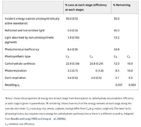 Table 1 illustrates the steps between light interception and yield, where energy is lost rather than being converted into biomass.