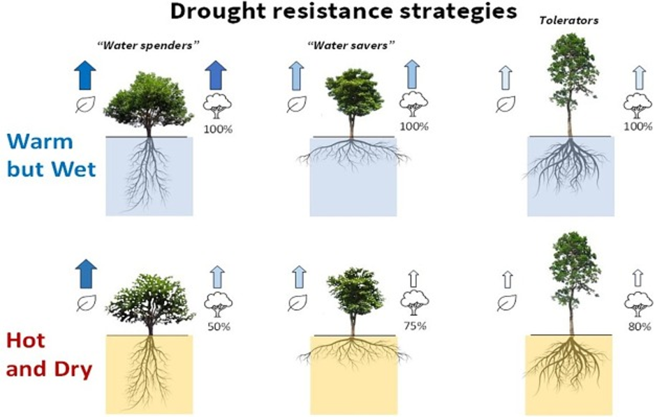 ii. Tree heat and drought response strategies: Three broad drought response strategies by trees were identified based on morphology and physiology: