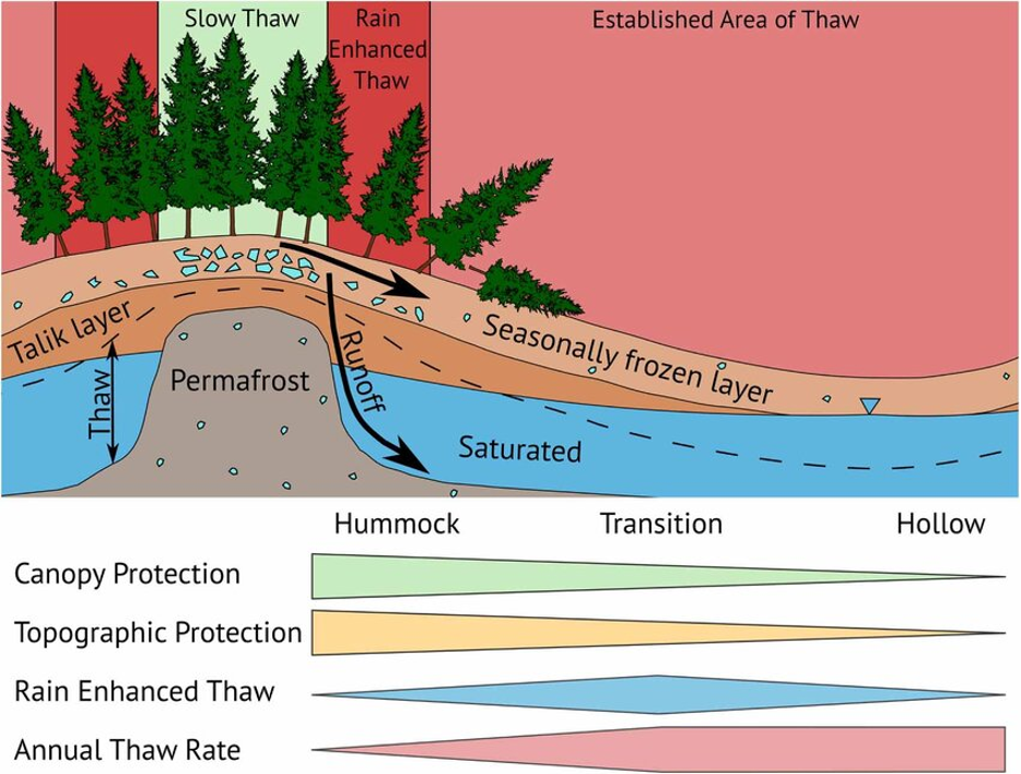 Eklof et al. 2024, studied the impact of rain, snow depth, microtopography, and canopy cover on thaw rates and the mechanisms responsible for it. The study was conducted in south-central Alaska, where the ecosystem-protected permafrost persists even in warm climates due to the favorable ecology of the site.