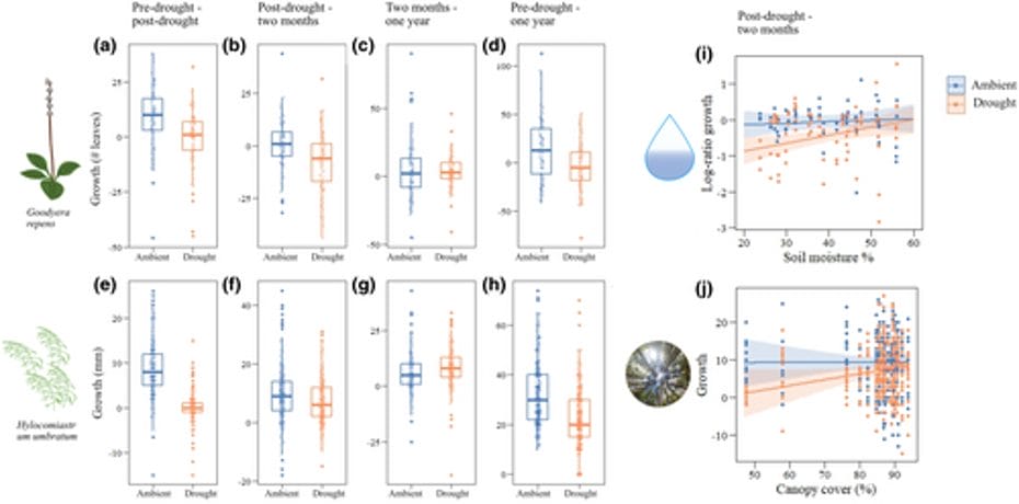 Figure 5: “Impact of drought on growth of Goodyera repens (a–d) and Hylocomiastrum umbratum (e–h). Interaction plots show effects of drought on growth 2 months after the drought treatment as a function of local soil moisture for G. repens (i), and canopy cover for H. umbratum (j),” Koelemeijer et al. (2024). (Image credits: https://doi.org/10.1111/gcb.17424).