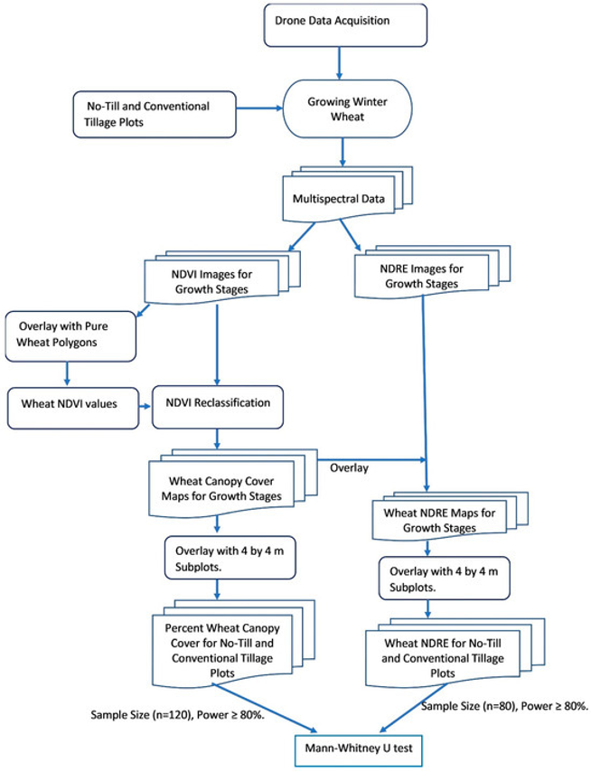 Figure 6: “Approach used to examine percent canopy cover and health of winter wheat in no-till and conventional tillage plots using drone,” Akumu et al. (2024). (Image credits: https://doi.org/10.3390/agriculture14050760)