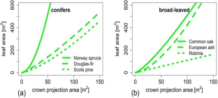 Figure 1: “Allometric relationship between leaf area and crown projection area shown for selected (a) conifers and (b) broad-leaved species. Crown quantity in terms of crown projection area can come along with very different species-specific crown quality in terms of leaf area,” Rahman et al. 2024. (Image credits: https://doi.org/10.1016/j.landurbplan.2024.105089)