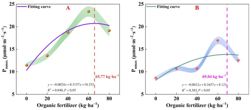 Figure 2: “Relationship between maximum net photosynthesis rate and organic fertilizer under fresh water (A) and brackish water (B) irrigation. Pnmax, maximum net photosynthesis rate,” Lin et al. 2024. (Image credits: doi: 10.3390/plants13101308)