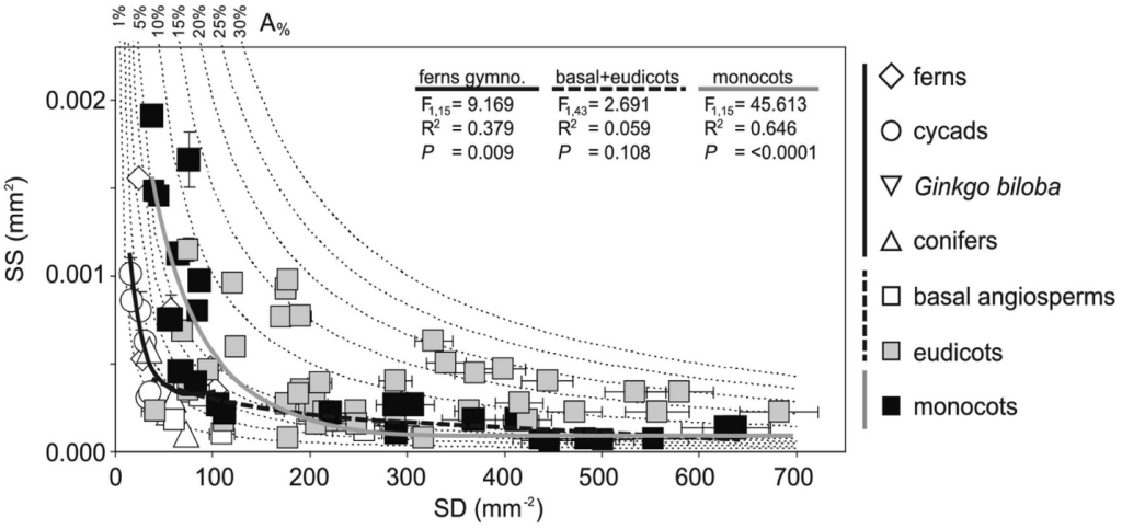 Figure 1.: “The relationship between stomatal density (SD) and stomatal size (SS) in an evolutionary range of extant plants. The dotted guidelines indicate the proportion of the epidermis area allotted to stomata (A%) and, therefore, available for leaf gas exchange – A% values are indicated in the upper left corner of the figure. Lines of best-fit using non-linear regression are shown for ferns with gymnosperms (solid black line), basal angiosperms with eudicots (broken black line), monocots (broken grey line), and all species (solid grey line),” Haworth et al. 2023. (Image credits: https://doi.org/10.1016/j.scitotenv.2022.160908).