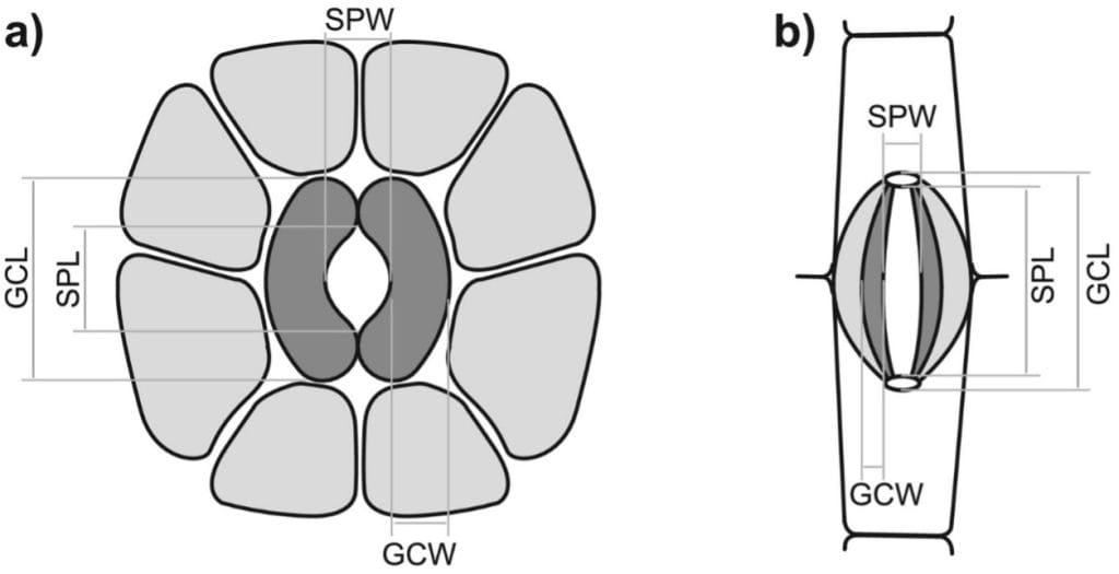 Figure 2.: “Example stomatal complexes: a) kidney-shaped stomatal complex, and; b) dumbbell-shaped stomatal complex. GCW = guard cell width; GCL = guard cell length; SPW = stomatal pore width; SPL = stomatal pore length. Stomatal size (SS) is calculated as SS = GCL ∗ (2 ∗ GCW),” Haworth et al. 2023. (Image credits: https://doi.org/10.1016/j.scitotenv.2022.160908).