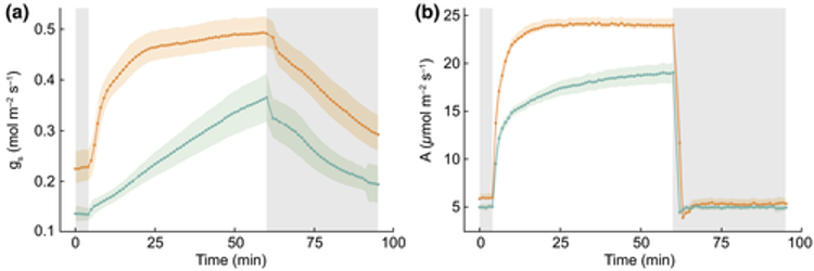 Figure 2: “Temporal responses of (a) stomatal conductance gs and (b) net CO2 assimilation A in Vicia faba (blue dots) and Avena sativa (red dots) to a step change increase followed by a decrease in irradiance. Values are an average of four replicates, and the colored shading represents plus/minus SE. The shaded and white areas represent light intensities of 100 μmol m−2 s−1 and 1000 μmol m−2 s−1, respectively. Data redrawn from McAusland et al. (2016),” Lawson and Vialet-Chabrand (2018). (Image credits: https://nph.onlinelibrary.wiley.com/doi/10.1111/nph.15330)