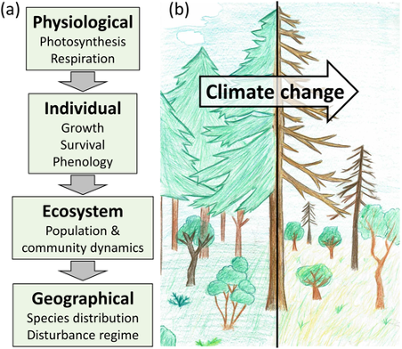 Figure 1: “Expected cascading effects (direct and indirect) of climate change on forest ecosystems from physiological to geographical processes (a). Being slow-migrating, sessile organisms, extant trees will have to acclimate to climate change in situ or, in some extreme cases, face mortality and ultimately local extinction resulting in ecosystem shifts” Kramer et al., 2020. (Image credits illustration by Hikaru Ishii, https://doi.org/10.1111/1440-1703.12127)