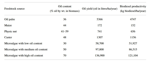 Table 1: “Comparison of oil content, oil yield, and biodiesel productivity of microalgae with the first and the second generation biodiesel feedstock source,” Medipally et al. 2015. (Credits: https://www.hindawi.com/journals/bmri/2015/519513/tab1/)