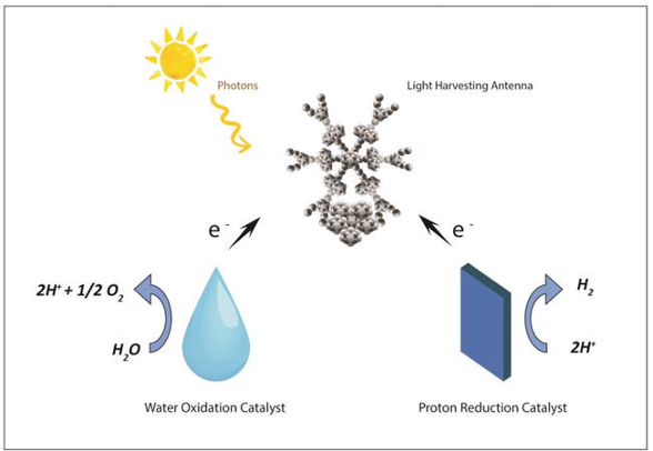 In the presence of sunlight absorbed by semiconductors, water is oxidized to produce oxygen, protons, and electrons. The electrons move to another part of the apparatus, while the proton is reduced to give hydrogen, see Figure 3.