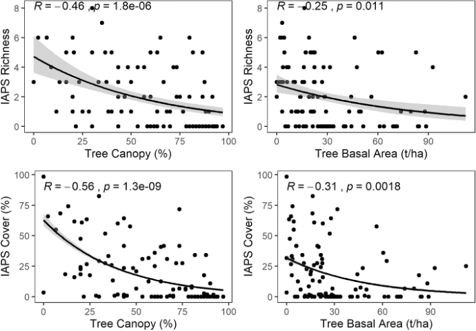 Natural forests are less prone to invasives than modified ecosystems because their canopy cover is more. Forest regrowth and restoration, which increase cover and close the canopy, suppress the spread of invasives. Species richness and canopy of invasives decreased when tree canopy cover and basal area increased, see Figure 1. It is reported as an unexpected benefit of managing degraded Shorea robusta forests in Nepal.