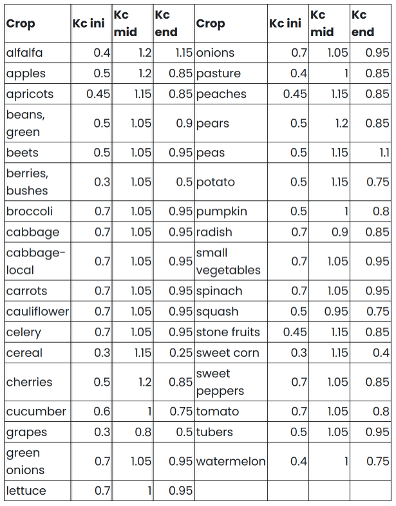 Table 1: Single crop coefficient for some typical crops grown in British Columbia, Canada, Farmwest.com. (Credits: https://farmwest.com/climate/calculator-information/et/crop-coefficients/)