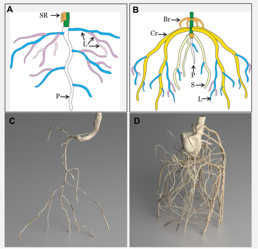 Figure 2: “Eudicot and monocot root systems. A and C represent eudicot roots, while B and D represent monocot roots. Schematic showing the dominant root types of tomato (A) and maize (B). SR = stem roots, P = primary root, L = lateral root, Br = brace root, Cr = crown root, S = seminal root (original diagram courtesy A. Rasmussen). MicroCT images of tomato (C) and maize (D) (images courtesy J. Johnson and S. Mairhofer),” Adapted from RSECO.org. (Image credits: https://www.rseco.org/content/definitions.html)