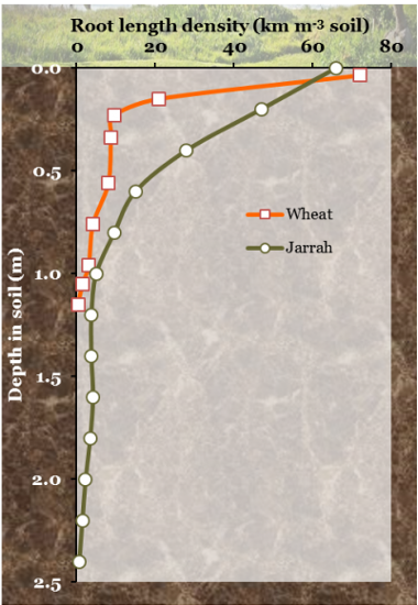 Figure 3: “Root length density in relation to depth in the soil for a wheat crop and a jarrah forest (Eucalyptus marginata),” RSECO.org. (Image credits: https://www.rseco.org/content/definitions.html)