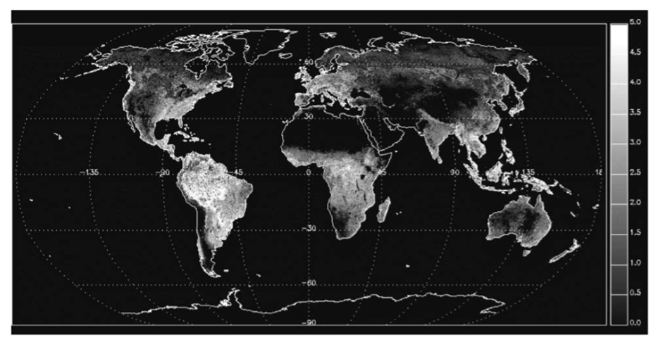 Figure 1: “Global mean annual LAI derived from NASA Sea WIFS sensor and the Myneni et al. (1997) canopy radiative transfer model,” Asner et al (2003). (Image credits: https://doi.org/10.1046/j.1466-822X.2003.00026.x)