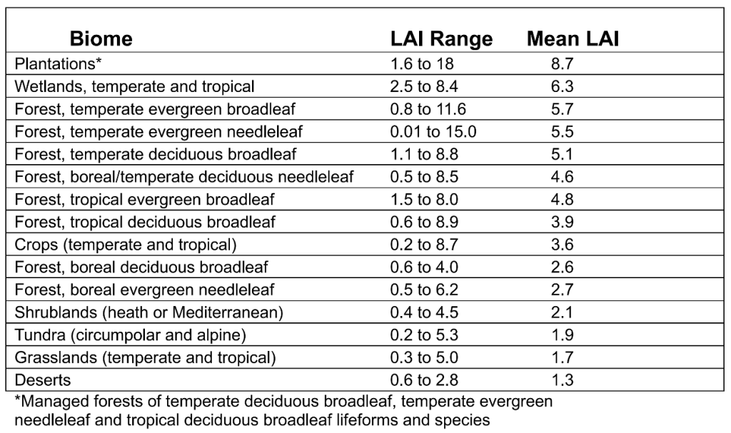 Table 1. The range and average LAI found in 15 biomes, based on data from Asner et al. 2003. (Credits: https://doi.org/10.1046/j.1466-822X.2003.00026.x)