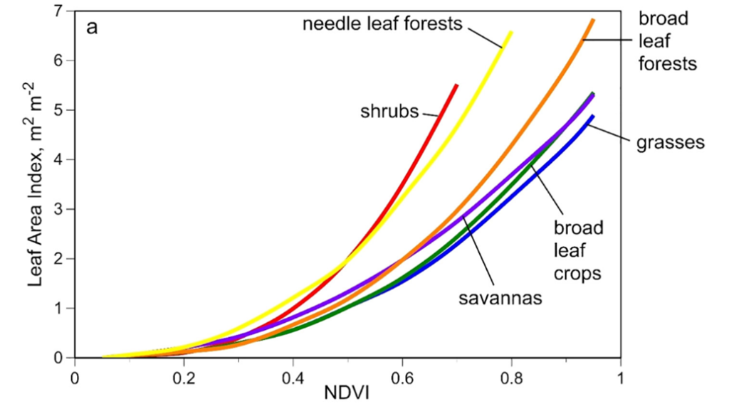 Figure 2: “LAI is commonly predicted with non-linear relations such as from various remotely sensed spectral indices, and relates to different sorts of leaf area arrangements according to plant functional type, besides other factors.” Packer (2020). (Image credits: https://doi.org/10.1016/j.foreco.2020.118496)