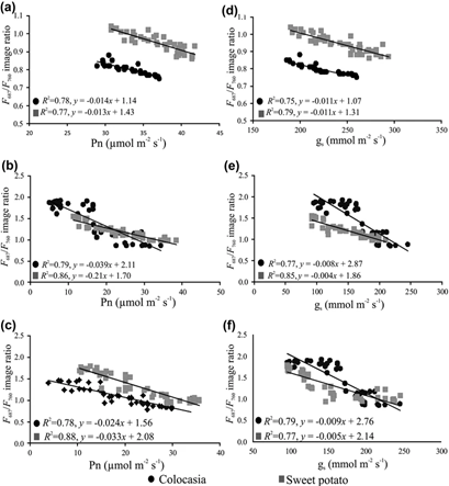Figure 1: “Relationships between F 687/F 760 ratios with (a) net photosynthetic rate (Pn) for control plants, (b) Pn for herbicide treated plants, (c) Pn for drought-stressed plants, (d) stomatal conductance (gs) for control plants, (e) gs for herbicide treated plants and (f) gs for drought-stressed plants,” Raji et al. 2017. (Image credits: https://doi.org/10.1007/s12524-016-0612-3)