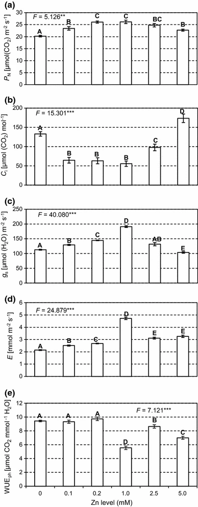 Figure 2: “P N net photosynthesis rate (a), C i intercellular CO2 concentration (b), g s stomatal conductance (c), E transpiration rate (d) and WUEph water use efficiency (e) in Salix leaves at different Zn application levels,” Borowiak et al 2017. (Image credits: Acta Physiol Plant 37, 155. https://doi.org/10.1007/s11738-015-1904-x)